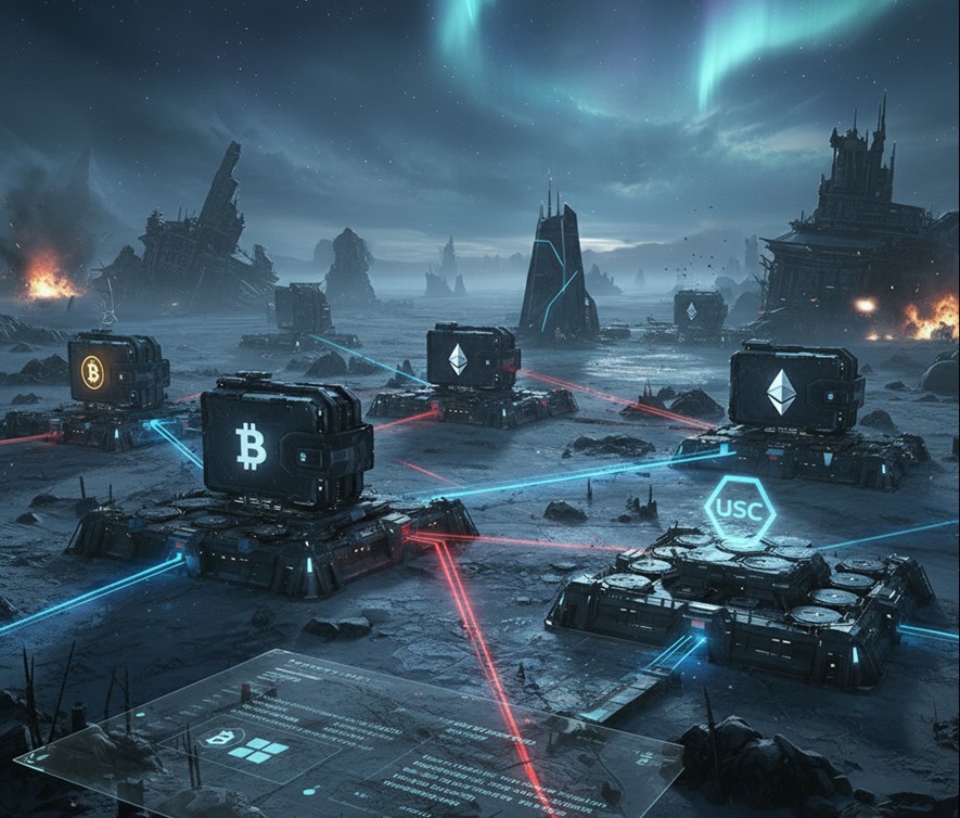 In a desolate, dystopian future, each cryptocurrency wallet is depicted as a fortified “Base,” a stronghold in a world that has collapsed.