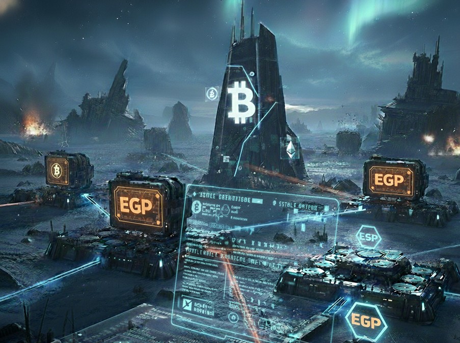 A vast landscape of countless bases (wallets), each bearing the EGP insignia, stands firmly across the barren, crimson dystopian terrain.